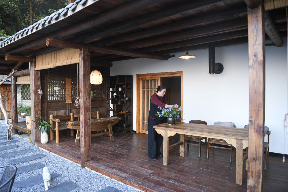 走進另一家“山隱”民宿,“可見之處皆有花”是這裏的特色。“山隱”民宿主理人、“90後”任文巧此前一直在外務工,看着改造後煥然一新的家,她主動返鄉與父母共同打理民宿。政府還邀請專業民宿運營團隊手把手教大家搭配菜品和餐具、運營新媒體賬號。