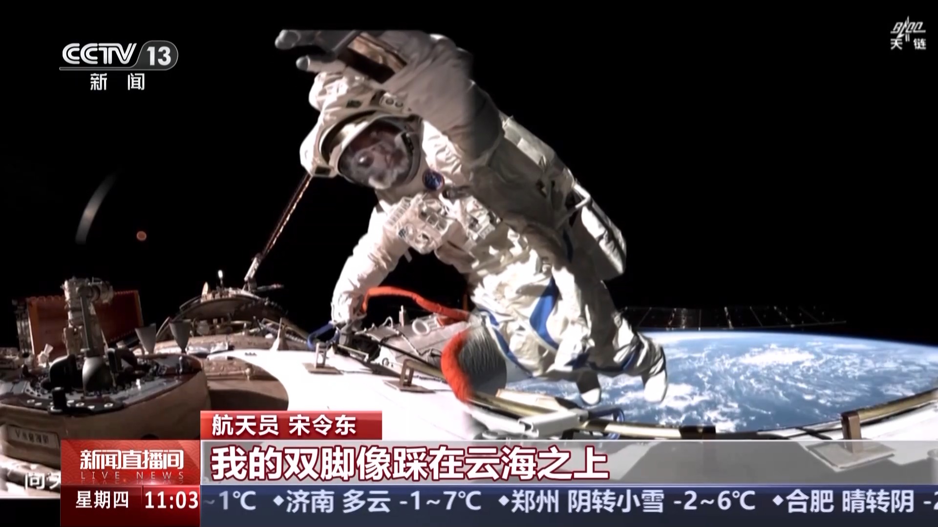 在出艙之前,我暢想過很多次出艙時的場景,但是當我真正身着飛天服,打開艙門看到地球的那一刻,我還是被深深地震撼到了,尤其是我攀爬在艙壁上,我的雙腳像踩在雲海之上。當我在欣賞太空美景的同時,也深深地感受到我們這份事業的厚重與偉大。