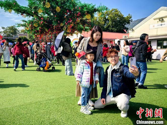 1月29日,“香港許願節2025”在香港大埔區林村許願廣場舉行。往廣場中央的許願樹上拋“寶牒”是許願節重點活動,吸引大批民眾前來。圖為香港市民在許願樹前合影。 中新社記者 劉大煒 攝
