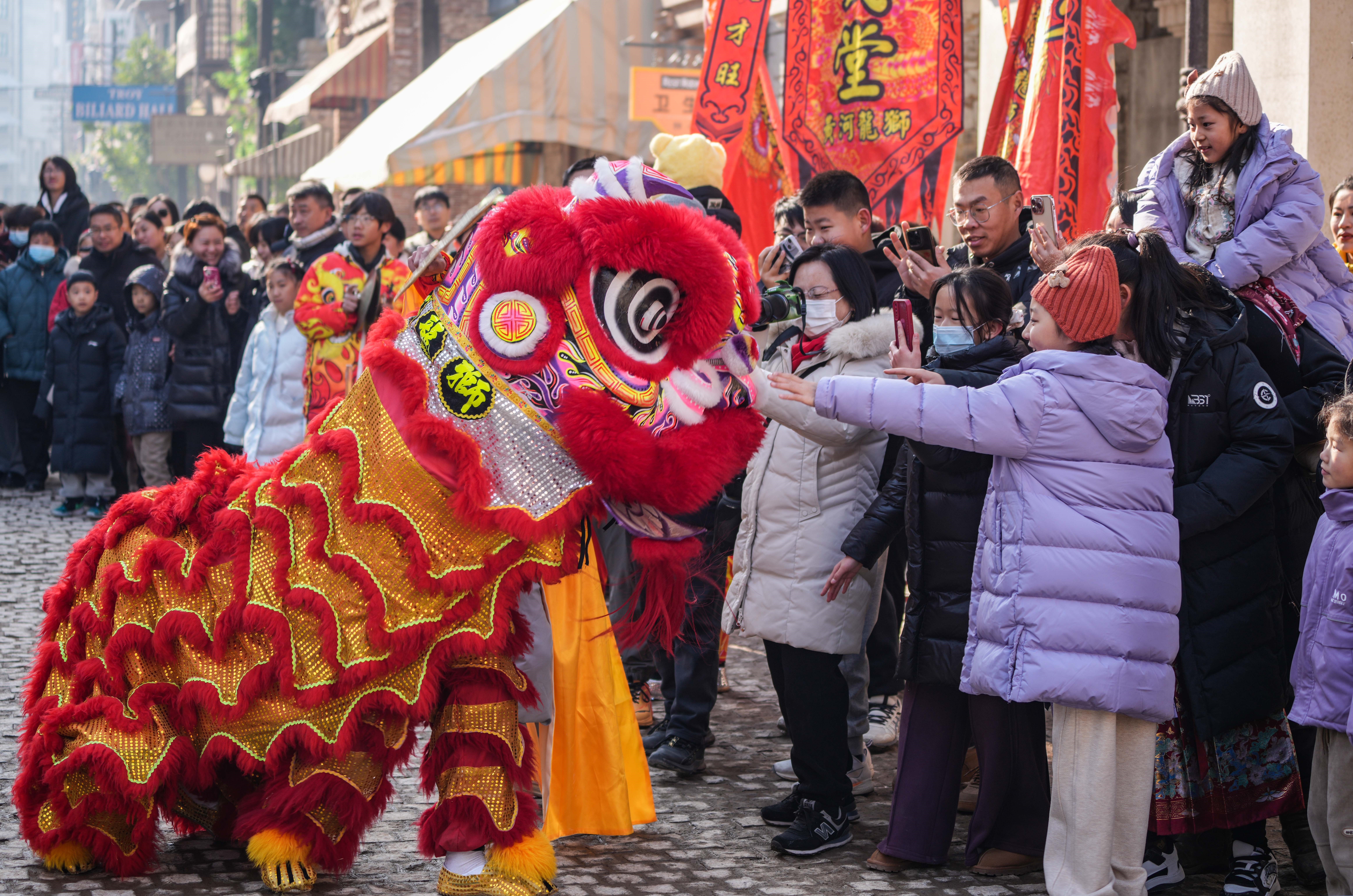 街道轉角處突然鑼鼓震天,一條由9人舞動的長龍從巷口騰躍而出,活靈活現地歡騰起舞,或上下翻飛,或蜿蜒盤旋,引得遊客陣陣喝彩,拍照留念。另一邊,幾隻活潑靈動的“舞獅”跑到孩子們面前撒嬌賣萌,逗得孩子們喜笑顏開,紛紛上手摸摸“舞獅”頭。