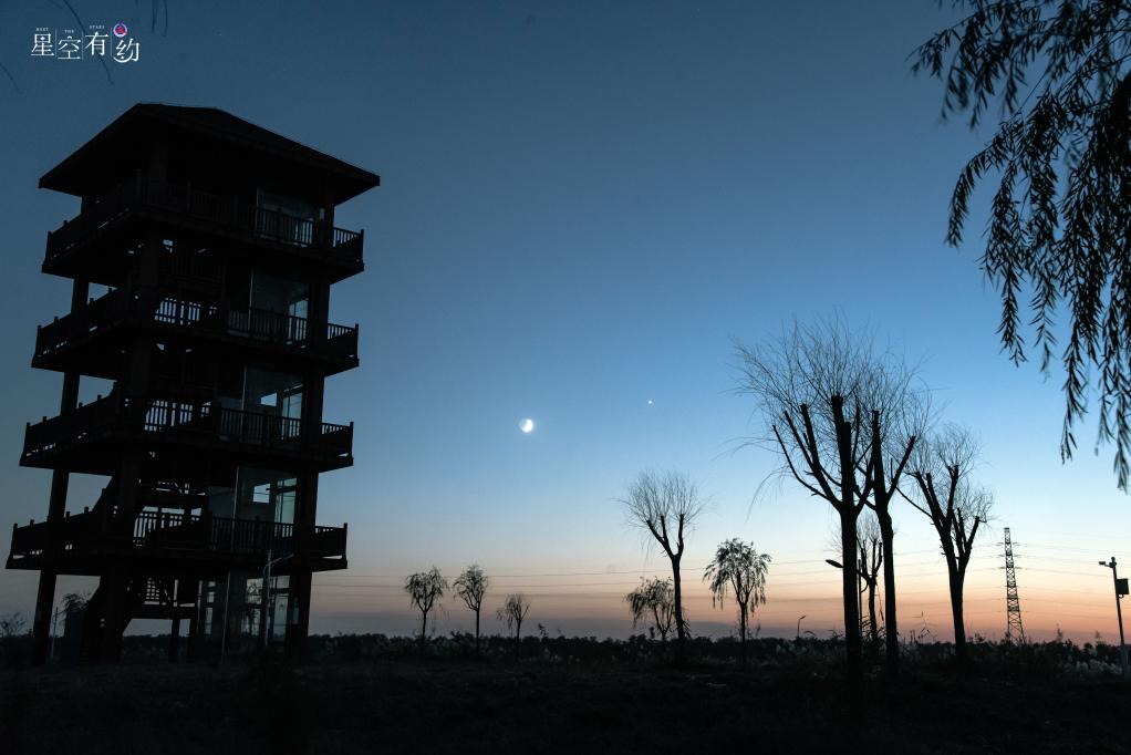 2024年11月5日在天津靜海區團泊湖拍攝的金星伴月。(楊婧攝)