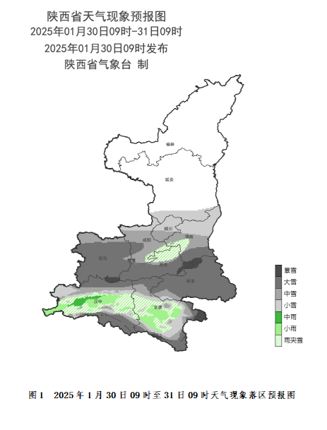 預計1月30日09時至31日09時,關中西部及南部、陝南東部和秦巴山區有中到大雪(3~10毫米),寶雞東南部局地、西安南部山區局地、渭南南部山區局地、商洛北部山區局地有暴雪(10~15毫米)。強降雪主要時段在30日夜間。