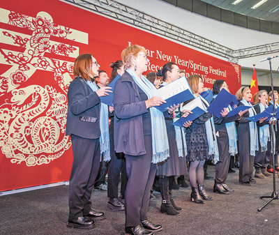 中國常駐維也納代表團日前在維也納聯合國總部舉辦新春招待會。圖為聯合國職員組成的合唱團演唱《茉莉花》。