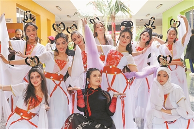 摩洛哥卡薩布蘭卡哈桑二世大學孔子學院日前舉辦慶新春活動。圖為該校學生表演舞蹈《天宮霓裳》後合影。