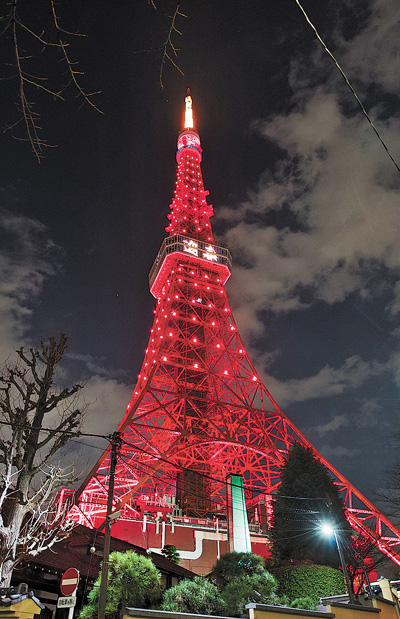 1月28日晚,日本東京的地標性建築東京塔點亮“中國紅”,塔身上顯示“迎春”字樣,慶祝中國農曆新年。