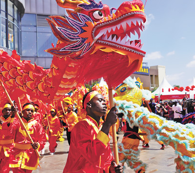 “温暖迎春·共慶中國年”春節廟會日前在肯尼亞首都內羅畢舉行。圖為廟會上的舞龍表演。