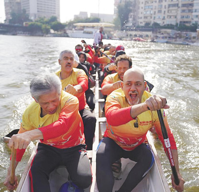 “尼羅泛龍舟”春節主題活動日前在埃及首都開羅舉行。圖為當地民眾開展龍舟競渡,共慶新春。