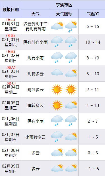 據浙江天氣,受暖濕氣流和冷空氣的先後影響,1月31日(初三)到2月2日(初五)浙江有一次降水、降温和大風天氣。2日夜裏到3日前期高海拔山區可能出現雨雪相態變化。