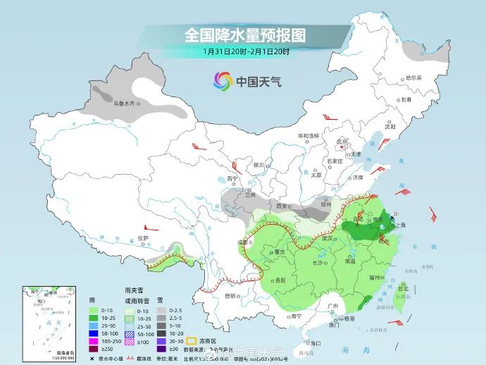 據中國天氣,*蛇年首場大範圍雨雪登場,昨夜起主要降雪時段到來。*昨天夜間至2月1日早晨將是此次降雪過程的主要時段,甘肅東部、陝西南部、黃淮西部、江漢北部等地有小到中雪或雨夾雪,陝西南部、湖北西北部、河南西部、甘肅東南部等地部分地區有大雪,局地暴雪。