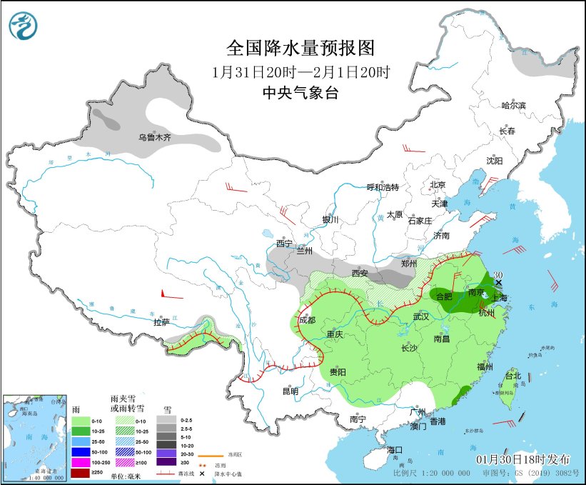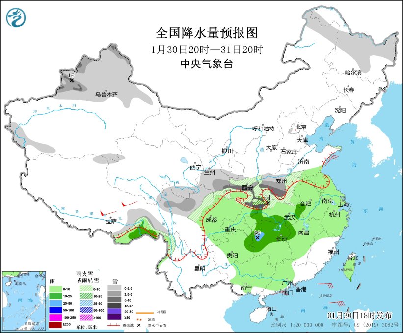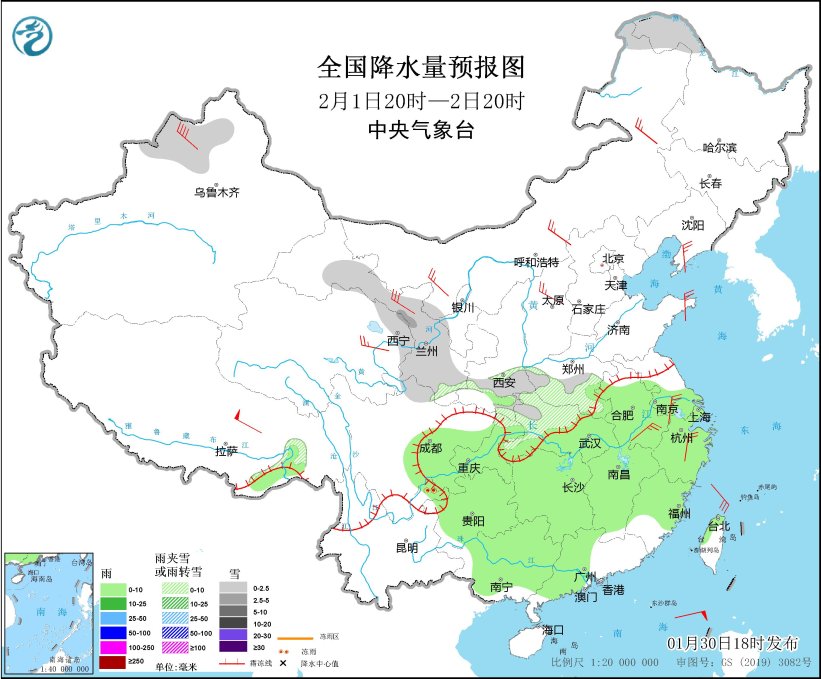 1月30日夜間至2月2日,中東部有較大範圍雨雪過程。甘肅東部、陝西南部、黃淮西部、江漢北部等地有小到中雪或雨夾雪,陝西南部、湖北西北部、河南西部、甘肅東南部等地部分地區有大雪,局地暴雪(10~15毫米)。上述地區新增積雪深度2~4釐米,局地6釐米以上,南方大部地區有小到中雨,局地大雨。