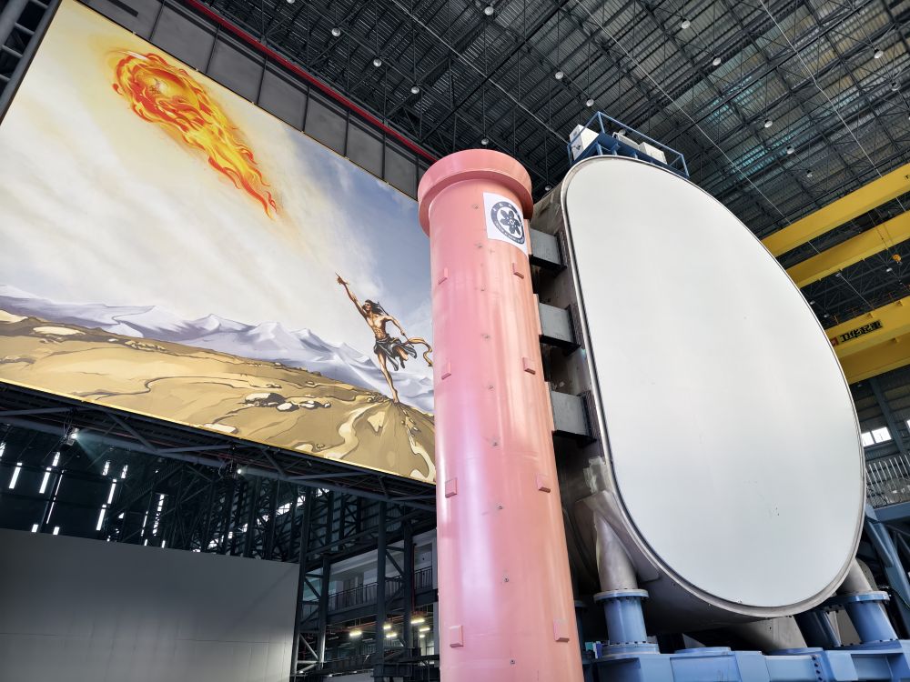 在11號廠房,牆壁上高達十幾米的夸父逐日畫像,襯托着一座形似“橘子瓣”的巨大腔體,讓科技藍為主色調的空間裏有了活躍的神韻。未來,八個這樣的“橘子瓣”合而為一,下一代“人造太陽”將在裏頭進行“燃燒”實驗。