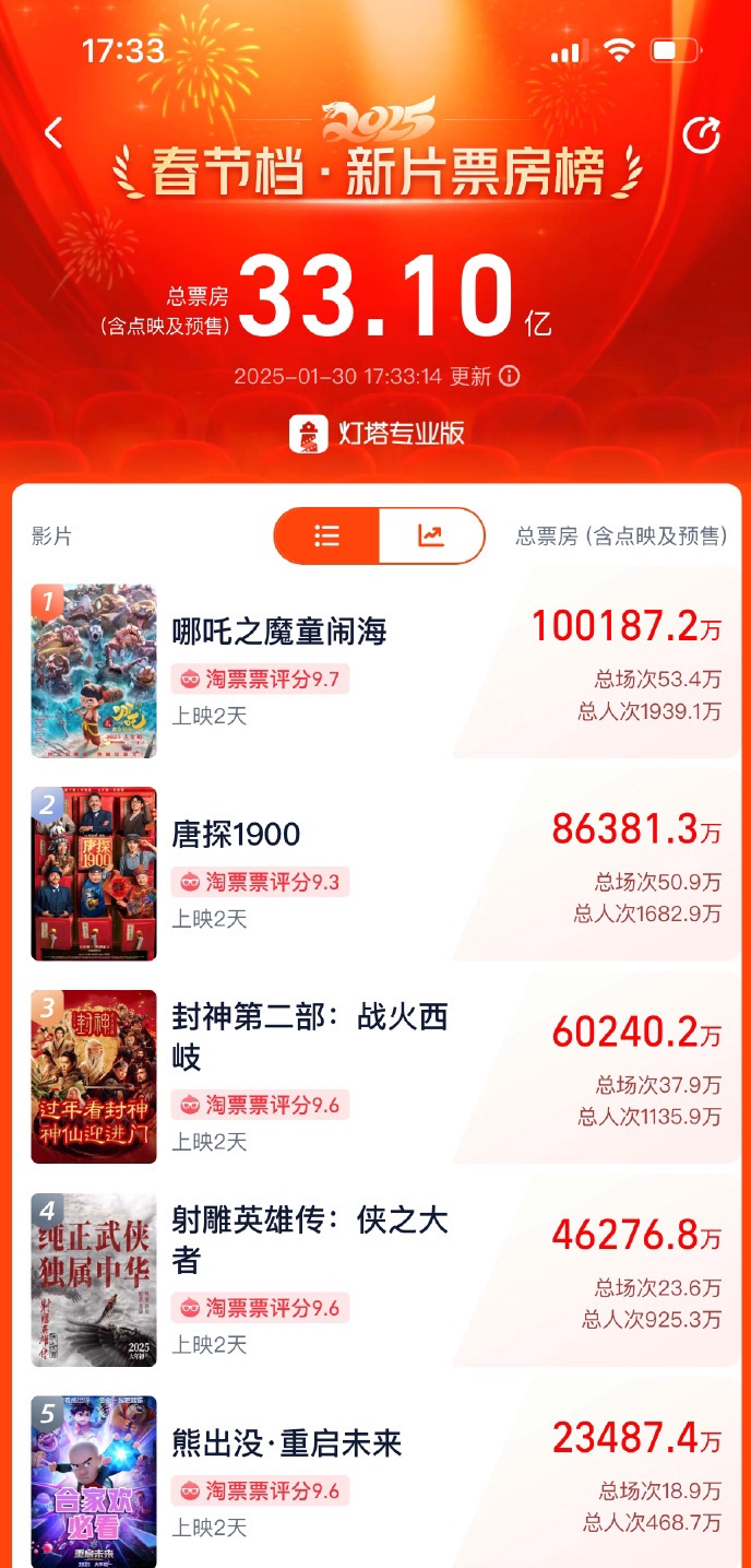 【環球網消費綜合報道】1月31日消息,2025 春節檔首部 10 億電影昨晚已經誕生,據燈塔專業版即時數據,截至 1 月 31 日 0 時 0 分,影片《哪吒之魔童鬧海》票房突破 11 億。截至1月30日14時,2025年春節檔(1月28日—2月4日)檔期總票房(含預售)已經突破30億。