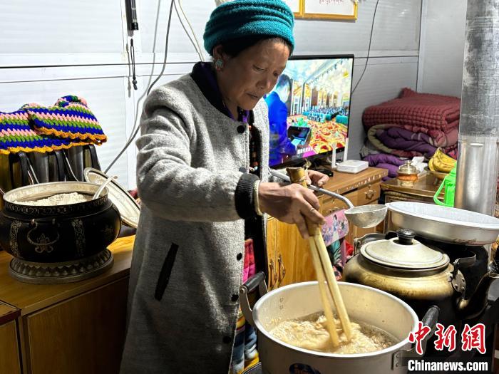 在日喀則市農事新年初一,煮“羌鍋”是家家户户必不可少的年俗。清晨六點半,天色尚朦朧,日喀則市拉孜縣錫欽鄉錫欽村安置點上,吳子周家的板房裏已是爐火熊熊。瓊拉早早起身,着手為家人準備新年美食,她先在鍋中倒入清水再放入青稞酒,待酒燒開後,又加入糌粑和奶渣,不一會兒,散發着誘人香氣的“羌鍋”便煮好了。