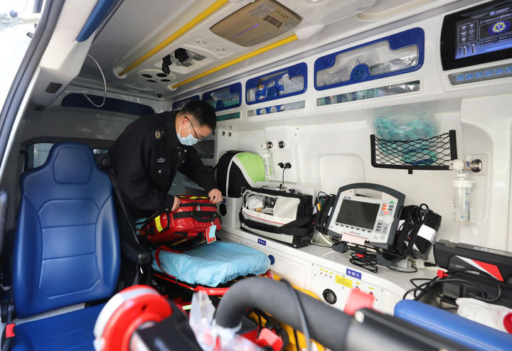 急救醫師曹鑫在出發前檢查整理救護車急救藥品和裝備。新華社記者 方喆 攝