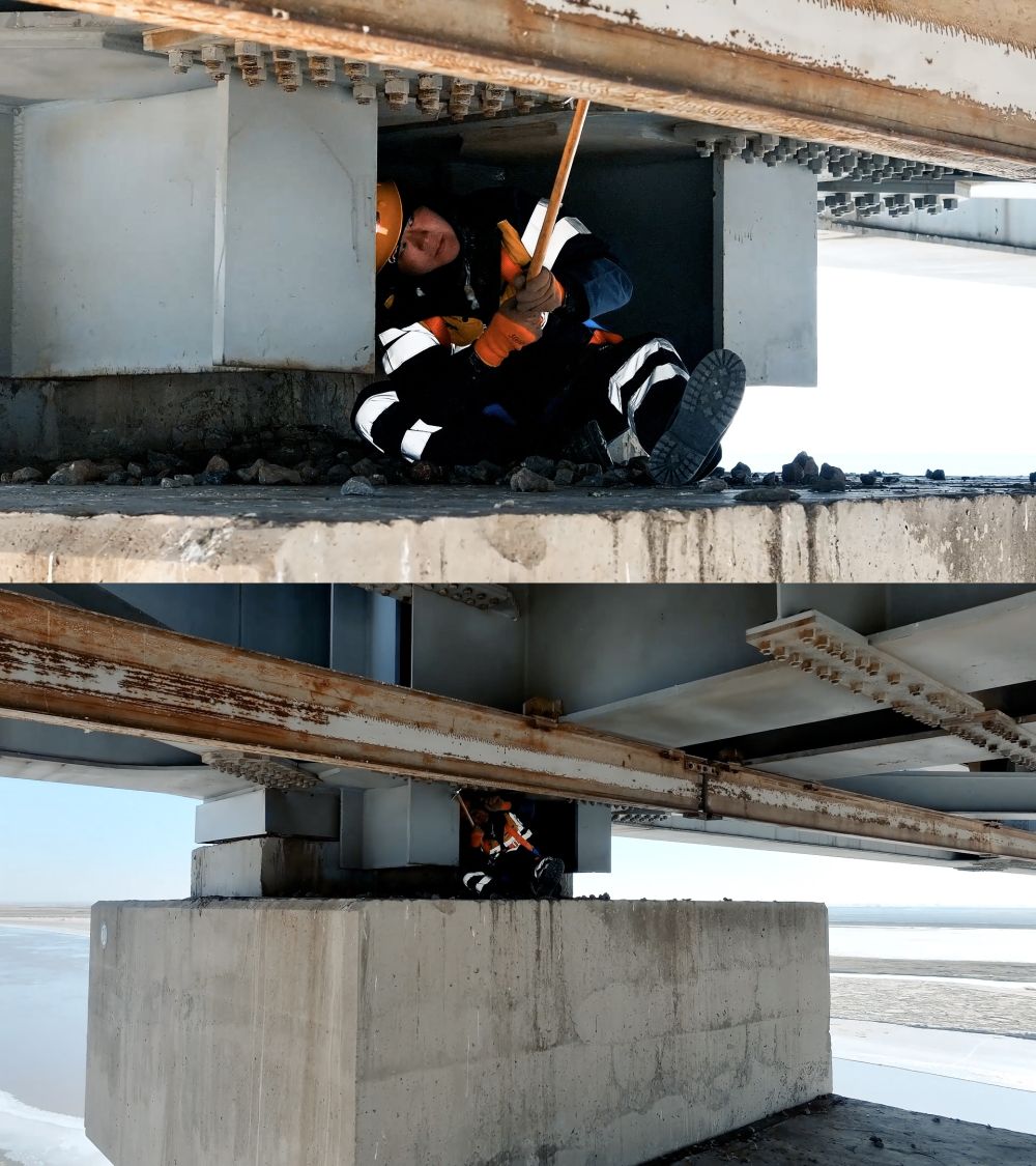 檢查橋墩上的螺栓時,人是無法站立的。新華社發