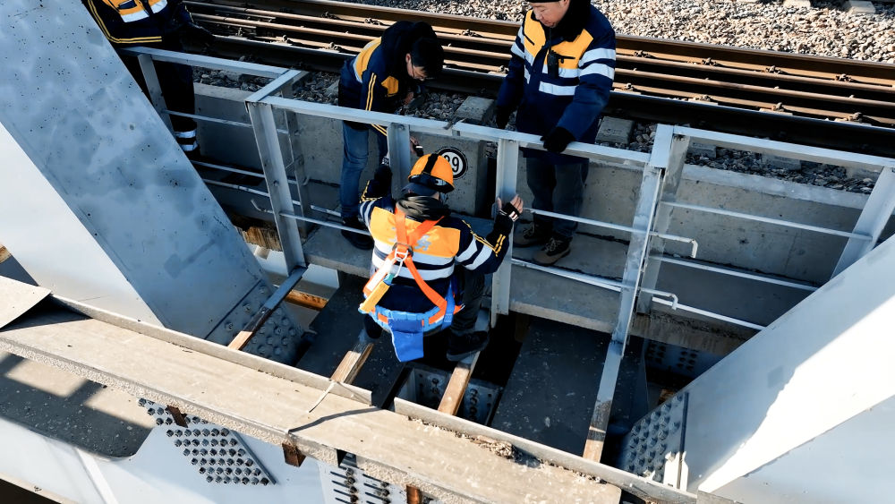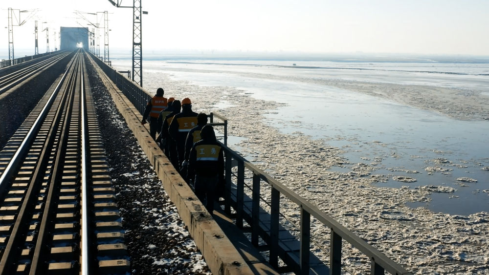 每天橋上都會有大約130趟列車通過。每次列車呼嘯而過,都會把寒風“砸”在我的臉上。在這樣的環境裏,我們一路檢查橋樑的設施有沒有損壞。