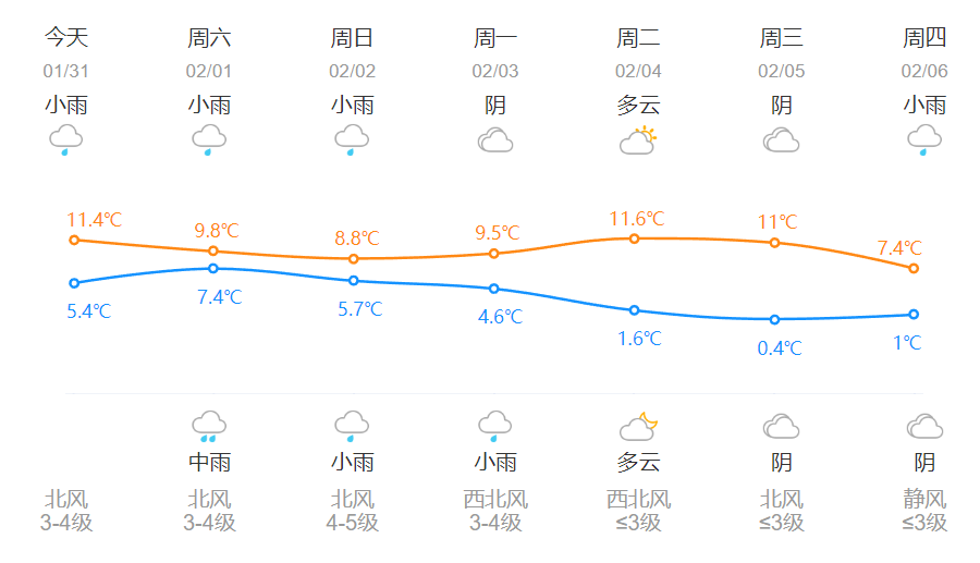 1日(初四):白天陰有時有小雨,夜裏陰有小雨,7~9℃,偏北風3-4級;