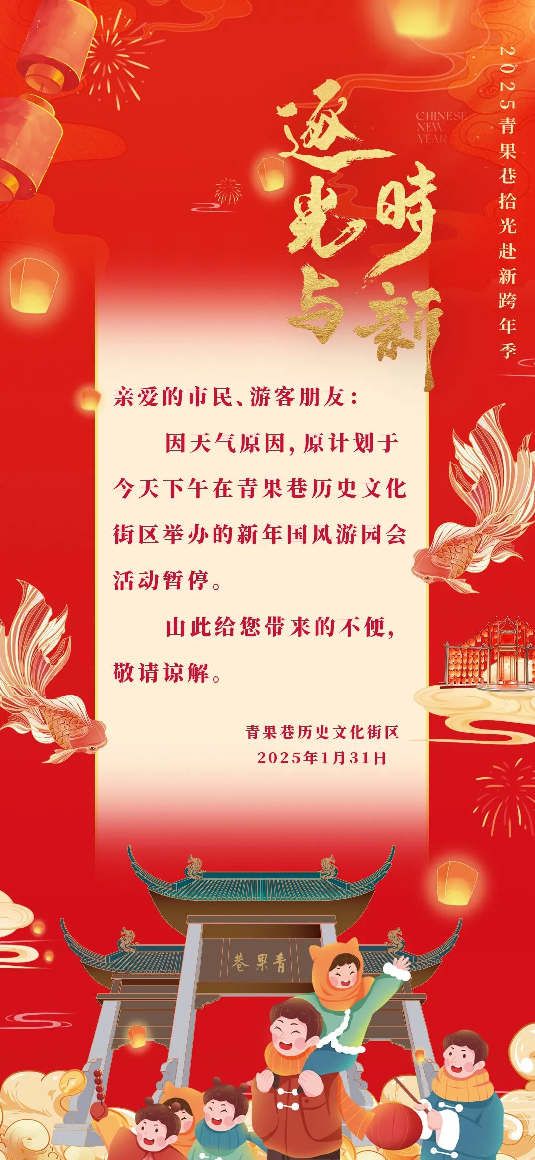 受天氣影響,為切實保障廣大市民、遊客的生命財產安全,經研究決定,無錫梅園景區1月31日“喜迎新春·梅園納福”新春夜遊活動暫停一晚。