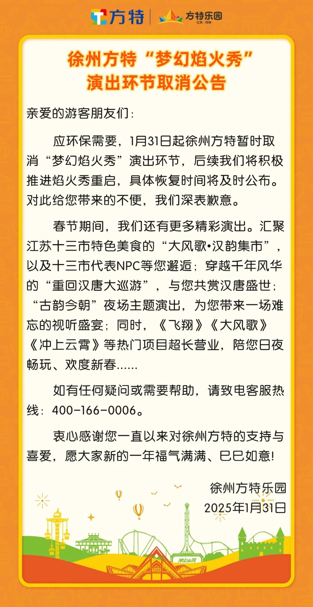 因雨水天氣,為確保遊客遊玩安全及煙花無人機演出效果,園區將取消大年初三(1月31日)、大年初四(2月1日)兩日晚間浮石地宮區域的煙花無人機表演,演出時間調整至大年初五(2月2日),大年初六(2月3日),大年初七(2月4日)每晚19:30—19:50,地點仍為浮石地宮區域。