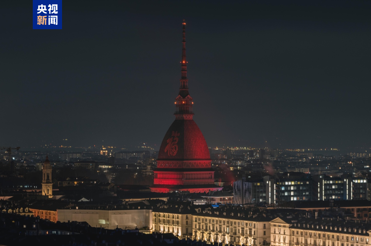 △都靈市安託內利尖塔的塔頂以燈光投射出巨幅蛇年紅色“福”字