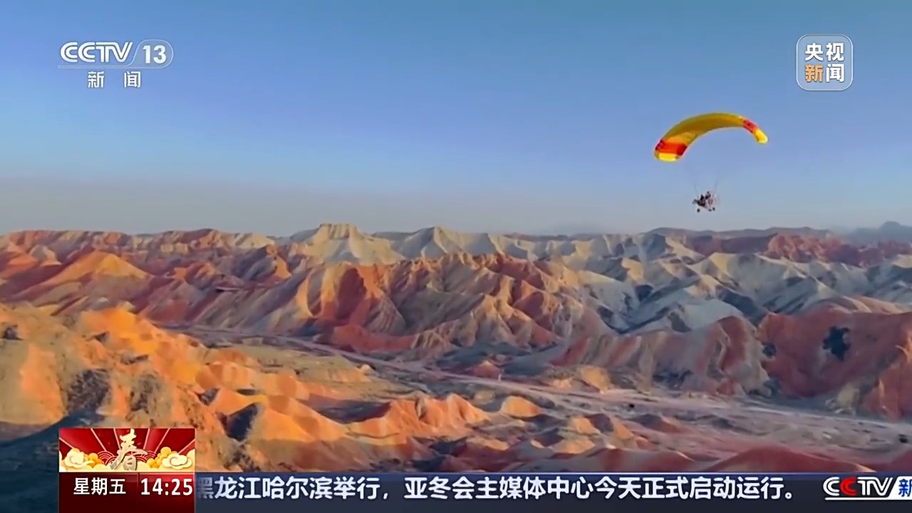 往西到河西走廊,可以到張掖七彩丹霞旅遊景區感受大自然的多彩。除夕到初七,遊客可以享受景區首道門票免費優惠。這裏是中國唯一一處彩色丘陵與丹霞地貌的高度複合區,您可以選擇在空中俯瞰冬日的陽光灑在斑斕的地表上,各種色彩交織在一起,如同調色盤上的傑作,又似是大地的織錦,每一抹色彩都藴含着歲月的故事,每一道紋理都記錄着風雨的痕跡。