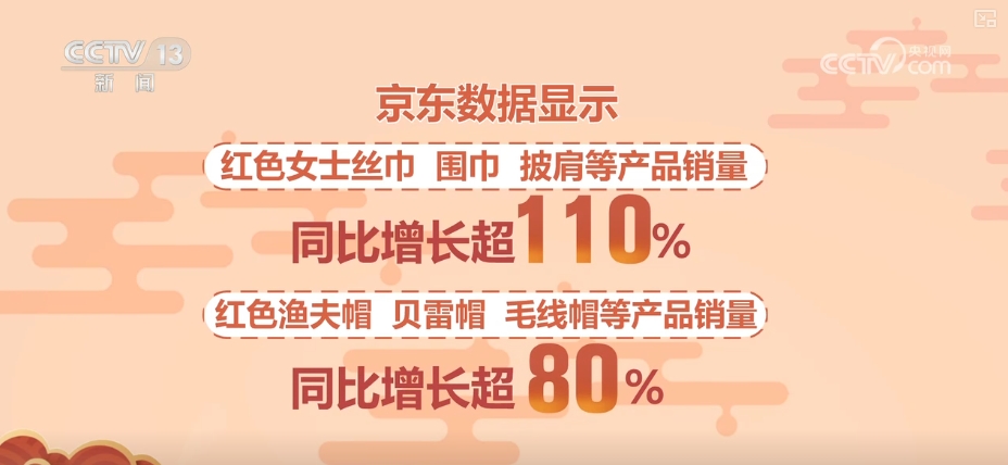 不僅是新年“戰袍”,新年配飾也要配齊。京東數據顯示,2025年,紅色的毛衣鏈銷量同比增長超七倍,紅色手鍊、腳鏈、戒指銷量同比增長超100%。也有很多用户選擇用紅色帽子、圍巾來增添節日氛圍,紅色女士絲巾、圍巾、披肩等產品銷量同比增長超110%,紅色漁夫帽、貝雷帽、毛線帽等產品銷量同比增長也超過了80%。