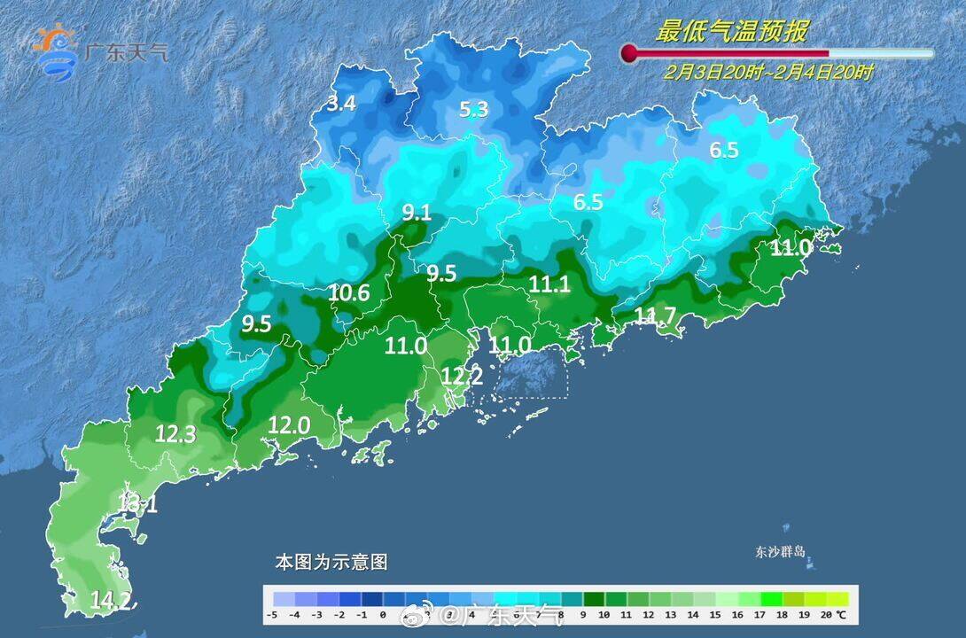 @廣東天氣 預計,2月3日到4日早晨,受冷空氣影響,廣東大部有小雨,日平均氣温將下降5~8℃,4日白天到5日轉多雲天氣,早晨前後將出現過程最低氣温,粵北市縣4~7℃(高海拔山區零下1~1℃)。另外,5日早晨粵西市縣和廣東省中西部海面有輕霧。