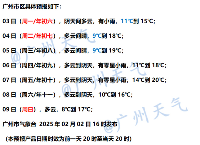 初七(2月4日),粵西市縣多雲,其餘市縣晴到多雲。最低氣温:粵北市縣4~7℃(高海拔山區零下1~1℃),南部市縣10~13℃,其餘市縣7~10℃。