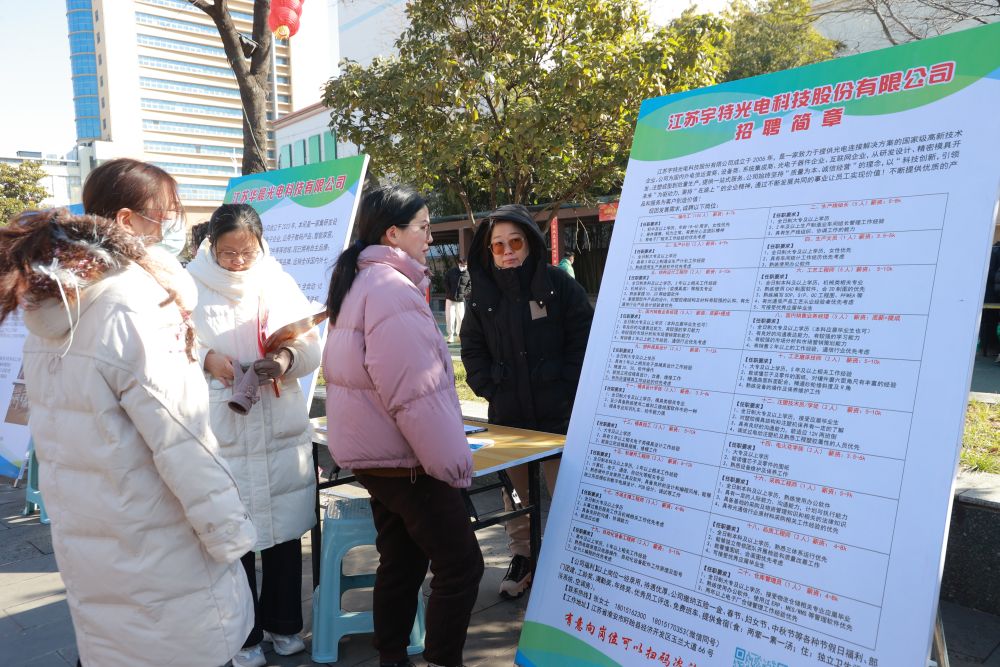 1月27日,江蘇省淮安市盱眙縣“2025年春風行動”招聘會現場,求職者在江蘇宇特光電科技股份有限公司招聘處查看崗位信息。(受訪者供圖)