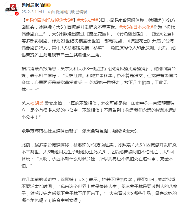 3日,據多家台灣媒體稱,徐熙娣(小S)方面證實,徐熙媛(大S)因流感併發肺炎不幸離世。作為“初代偶像劇女王”,大S徐熙媛出演過《流星花園》、《轉角遇到愛》、《泡沫之夏》等多部影視劇。作為21世紀初橫空出世的一部電視劇,《流星花園》開啓了台灣偶像劇新次元,其中大S徐熙媛憑藉“杉菜”一角的演繹令人印象深刻。此後,她也曾提名上海電視節白玉蘭獎最佳女主角。
