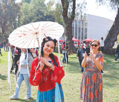 在墨西哥第四屆中國新年文化節上,當地青年身着中國傳統服飾留影紀念。