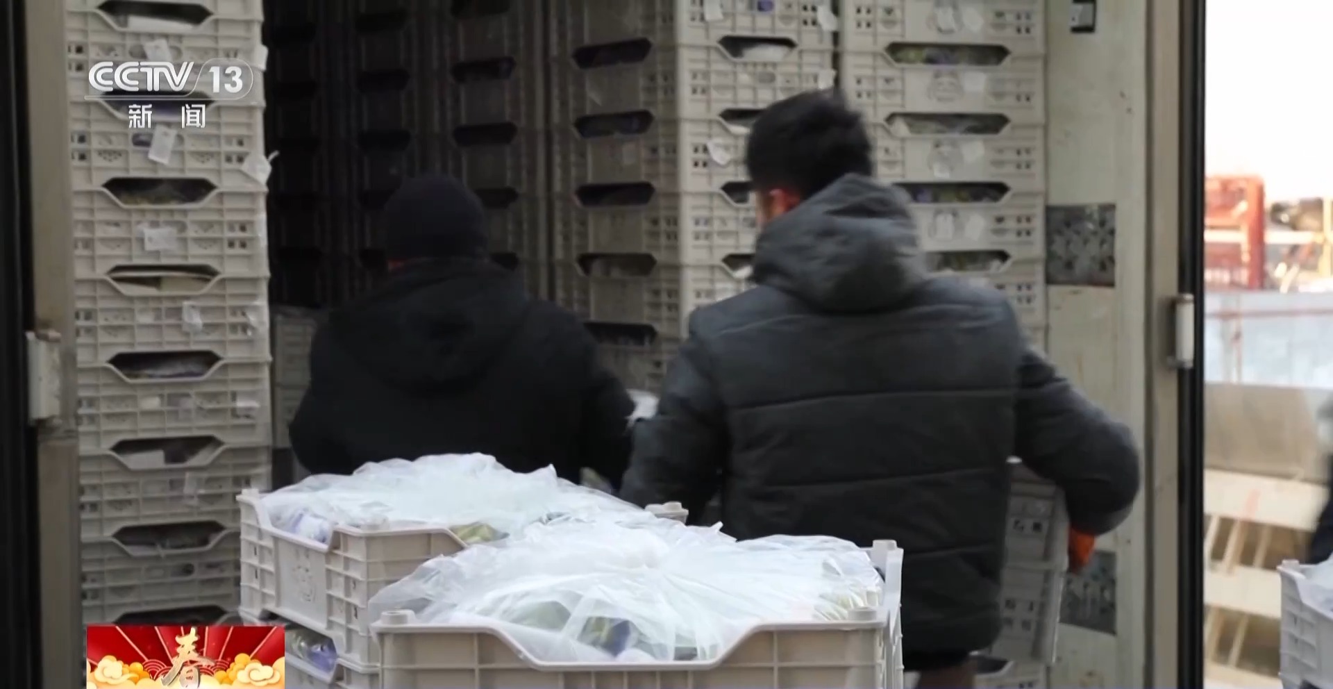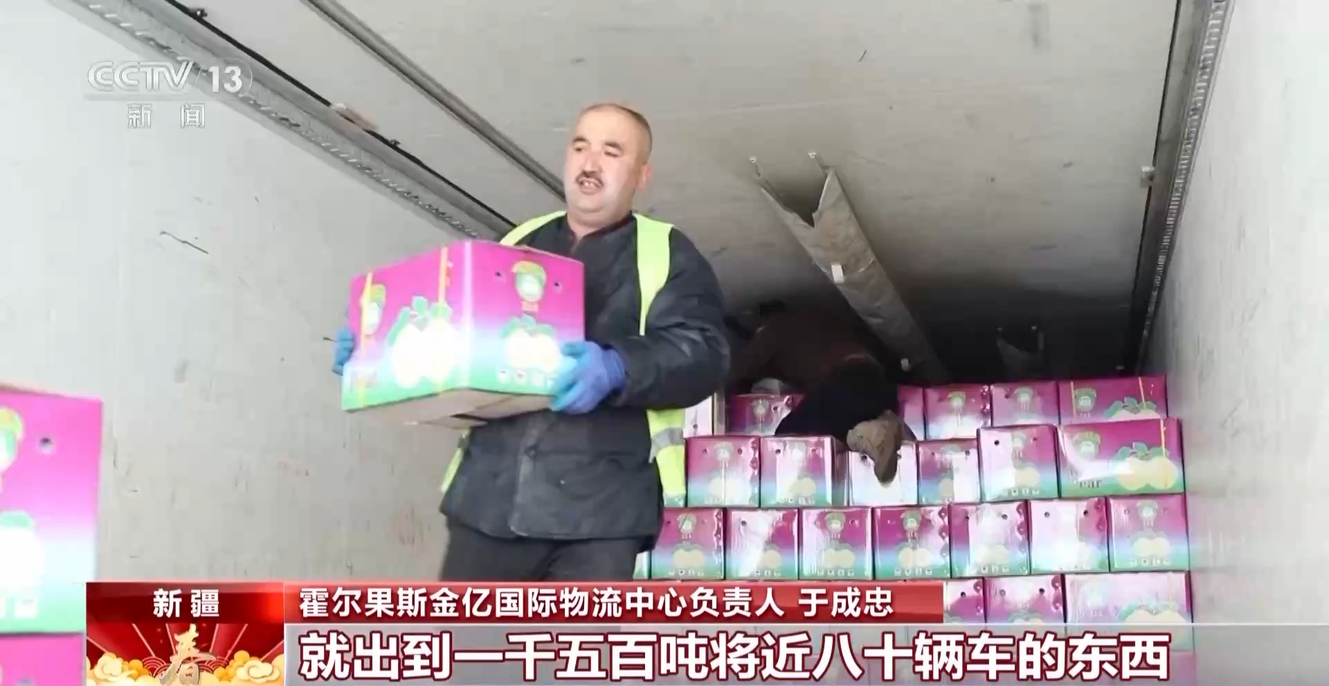 *霍爾果斯金億國際物流中心負責人 於成忠:*正值中國春節,國外的一些華人華僑也好,國外的客商、老百姓也好,他們目前對我們中國的這些蔬菜需求量很大,比如説現在我們每天出境的這些水果蔬菜,就能出到1500噸將近80輛車的東西,分佈到各個國家。