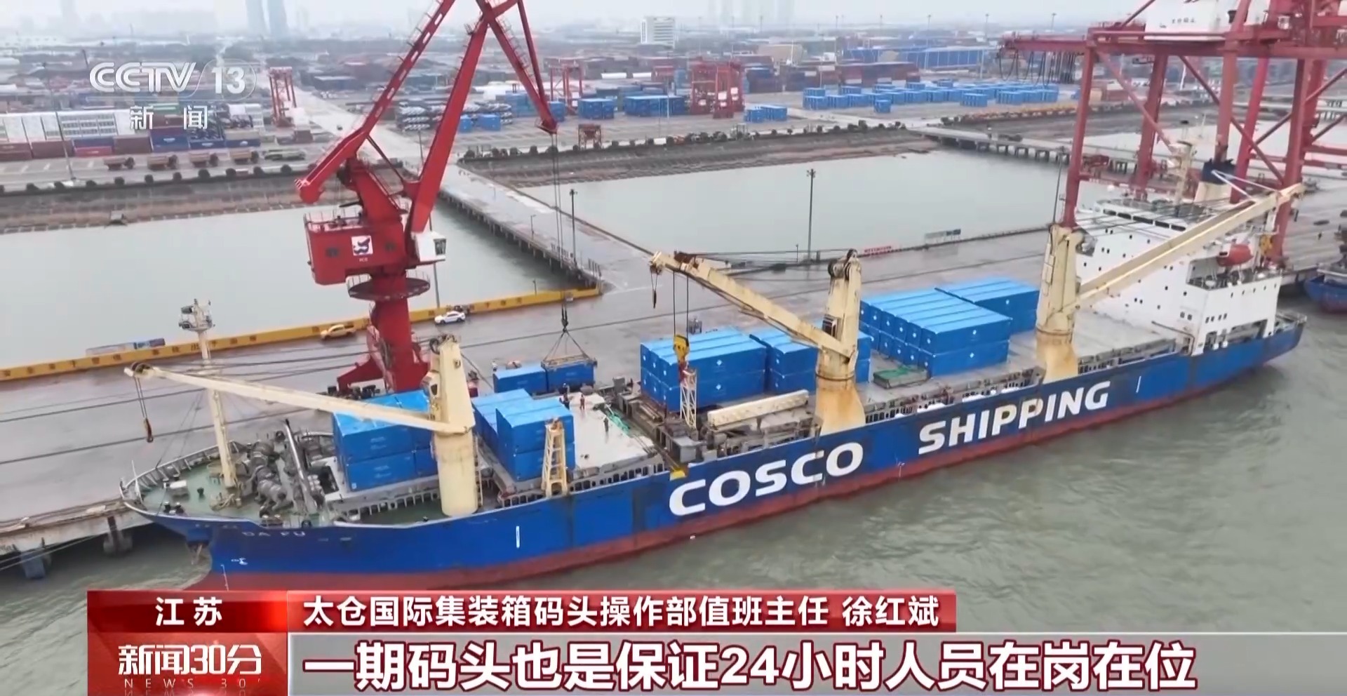 *太倉國際集裝箱碼頭操作部值班主任 徐紅斌:*一期碼頭春節期間總共有500多台儲能櫃要運到中東,一期碼頭也是保證24小時人員在崗在位。