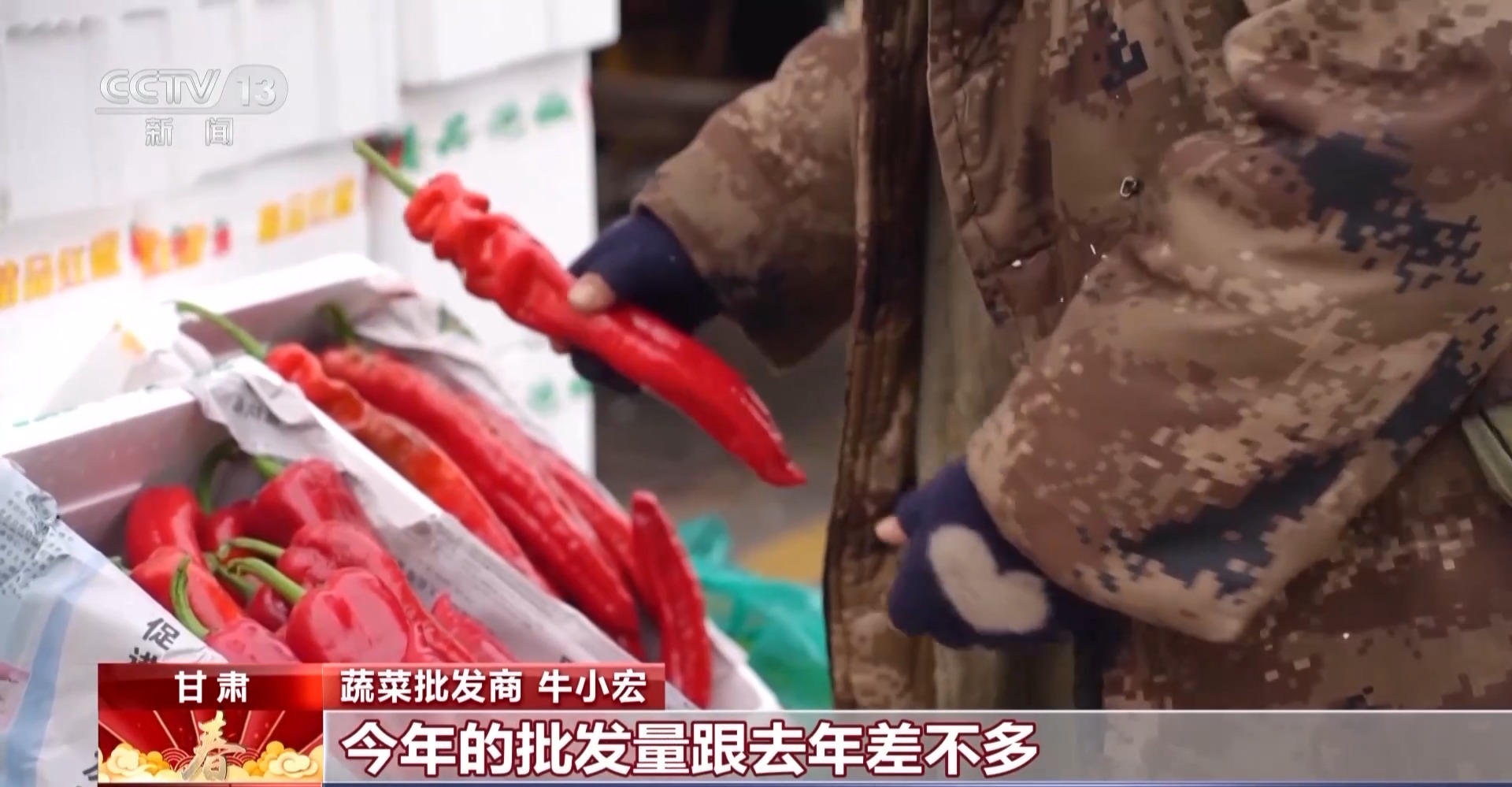 *蔬菜批發商 牛小宏:*山東的長茄、尖椒。今年的批發量跟去年差不多,像雲南的也可以,每天批發一車半,大概五萬斤左右。