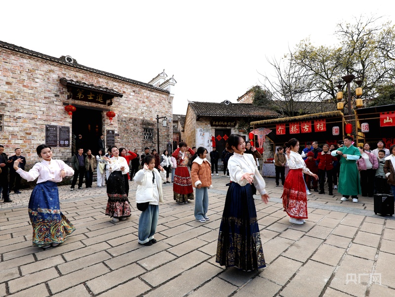 遊客在江西新余分宜縣分宜鎮介橋古村大明市集觀看並參與舞蹈表演(央廣網發 袁建兵 攝)