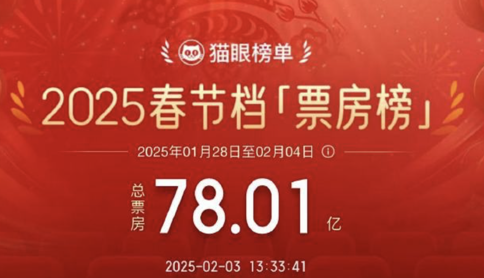【環球網科技綜合報道】2月3日消息,據貓眼專業版數據,2月3日13時33分,2025春節檔總票房(含預售)破78億!《哪吒之魔童鬧海》《唐探1900》《封神第二部:戰火西岐》分列春節檔票房榜前三位。