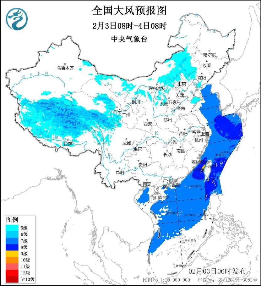 中央氣象台2月3日06時發佈大風藍色預警:預計,2月3日08時至4日08時,西藏大部、青海中南部和東部、內蒙古大部、華北北部和西部等地將有5~6級、陣風7~8級的大風,其中西藏北部、青海南部部分地區風力可達6~8級、陣風9~10級。
