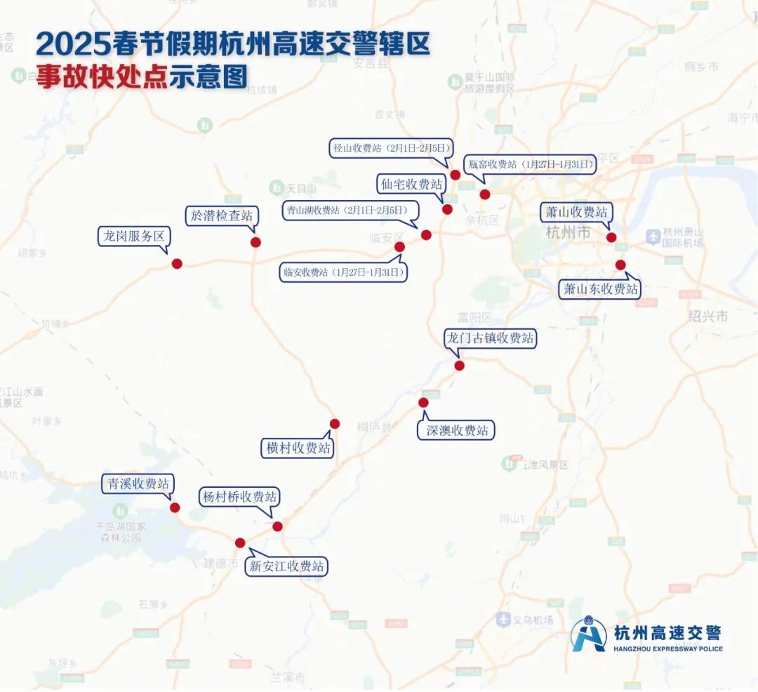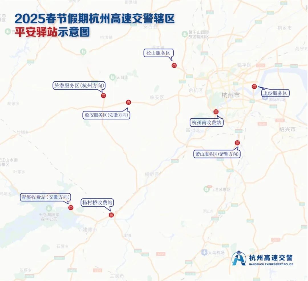 春節假期返程期間,轄區各服務區、收費站都會出現車輛飽和情況,其中臨安服務區、龍崗服務區、建德服務區、桐廬服務區4個服務區,杭州西收費站、新蕭山收費站、蕭山城區收費站、新街收費站、紫金港收費站、杭州南收費站、新杭州收費站、南莊兜收費站8個收費站容易飽和甚至出現排隊倒灌至主線現象。
