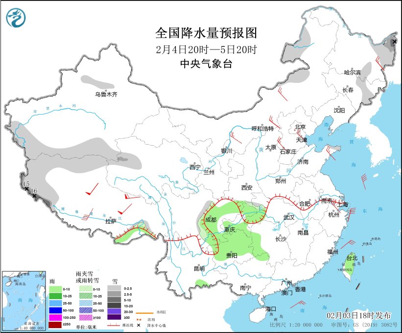 *2月3日20時至4日20時,*西藏西部、新疆西部和沿天山高海拔地區、內蒙古東部、黑龍江北部和東部、吉林東部、山西北部等地部分地區有小雪或雨夾雪,其中,西藏西部部分地區有中到大雪,局地暴雪(10~19毫米)。福建東南部、四川盆地南部、貴州西北部、雲南南部、海南島南部、台灣島中東部等地部分地區有小雨,其中,台灣島東部部分地區有中雨。內蒙古中部、青海南部、西藏北部、華北北部和西部、浙江北部等地部分地區有4~6級風,其中,西藏北部部分地區有7~8級風,黃海、東海、台灣海峽、台灣以東洋麪、巴士海峽、南海大部海域、北部灣有7~8級、陣風9級的大風(見圖2)。