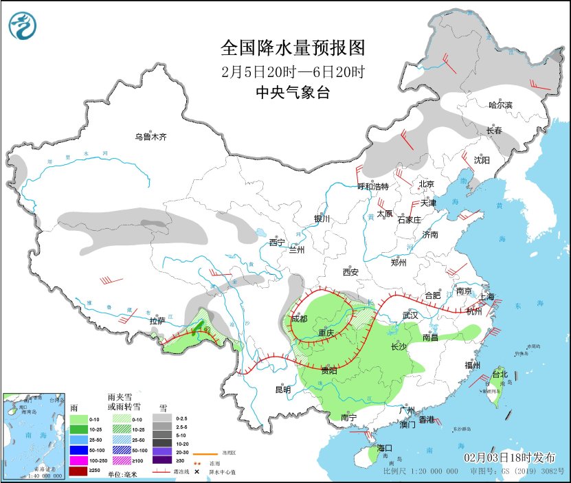 圖4 全國降水量預報圖(2月5日20時-6日20時)