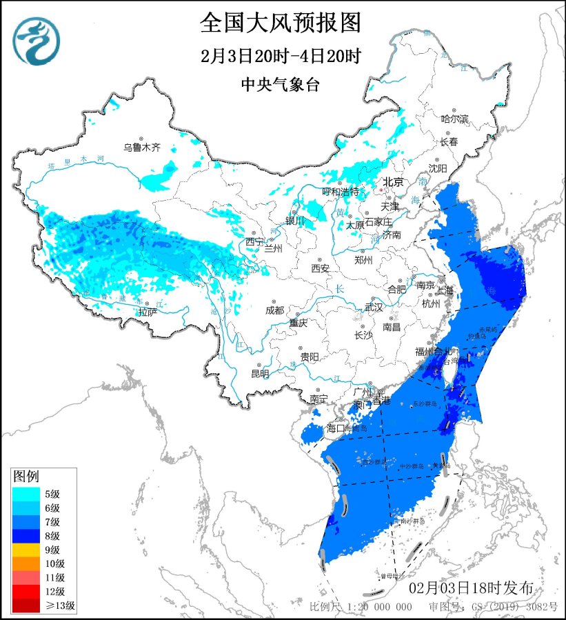2月3日夜間,冷空氣將繼續影響中東部地區,東北地區北部和東部、江淮、江南中東部、華南中東部等地氣温下降4~6℃,部分地區下降8℃,北方地區伴有4~5級風,陣風7~8級。東部和南部海域有6~8級、陣風9~10級大風。中央氣象台2月3日18時繼續發佈大風藍色預警:預計,2月3日20時至4日20時,新疆東部、西藏中北部、青海南部、內蒙古中部、陝西北部、華北北部和西部等地有5~6級、陣風7~8級的大風,其中,其中西藏北部、青海南部部分地區風力可達6~8級、陣風9~10級。黃海大部海域、東海大部海域、台灣海峽、台灣以東洋麪、巴士海峽、南海大部海域、北部灣將有7~8級、陣風9級的大風,其中台灣海峽、巴士海峽的部分海域風力可達9級、陣風10級(見圖1)。
