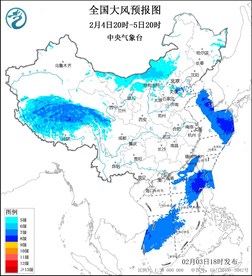 2月4日20時至5日20時,西藏中北部、青海南部、內蒙古中西部、華北、山東半島北部、黑龍江東部、吉林東部等地部分地區將有5~6級、陣風7~8級的大風,其中西藏北部、青海南部、內蒙古中部部分地區風力可達6~8級、陣風9~10級;渤海、黃海大部海域、東海大部海域、台灣海峽、台灣以東洋麪、巴士海峽、南海大部海域、北部灣將有7~8級、陣風9級的大風,其中巴士海峽的部分海域風力可達9級、陣風10級。