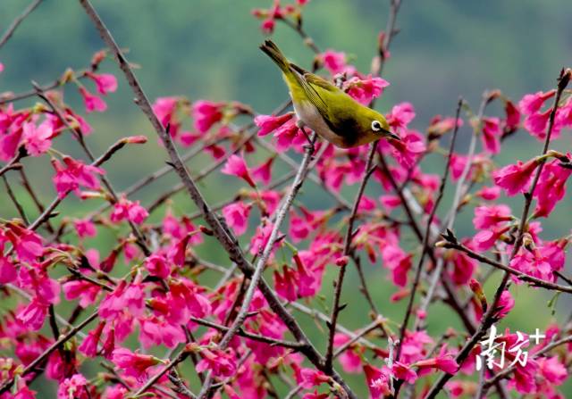 廣州黃埔創業公園櫻花盛開,繡眼在花叢中歡樂覓食。