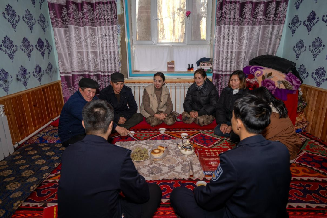 當宣傳隊走進一處氈房,一位柯爾克孜族牧民熱情地拿出了奶茶和饢。隊員們和牧民盤腿而坐,一邊吃着饢,一邊聊起了家長裏短,講起了國家安全常識。