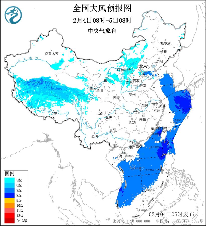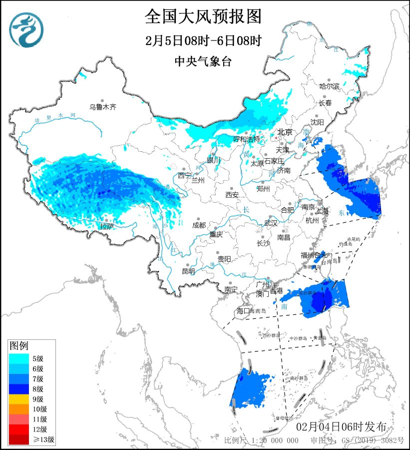 預計,2月4日08時至5日08時,西藏中北部、青海南部、內蒙古中部、新疆東部山口、寧夏北部、陝西北部、華北西北部和東部等地部分地區有5~6級、陣風7~8級的大風,其中,西藏北部、青海西南部部分地區風力可達6~8級、陣風9~10級;渤海、黃海大部海域、東海大部海域、台灣海峽、台灣以東洋麪、巴士海峽、南海大部海域將有7~8級、陣風9級的大風,其中台灣海峽、巴士海峽的部分海域風力可達9級、陣風10級。