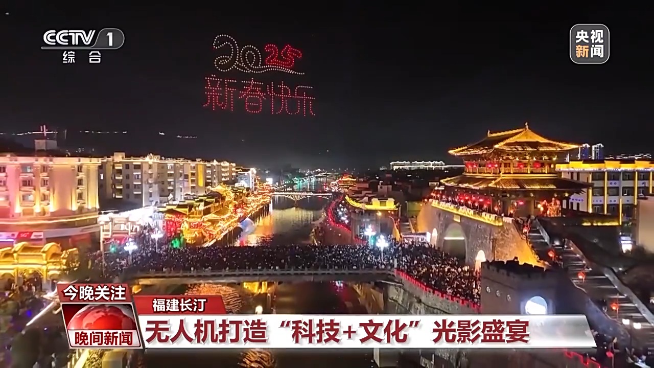 在福建龍巖的長汀古城,當夜幕降臨,千台無人機緩緩升空,不僅呈現出蛇年“福”文化的不同圖案,還以長汀古城的歷史建築為背景,呈現出一系列代表古城元素的圖案,為市民和遊客營造了濃厚的節日喜慶氛圍。
