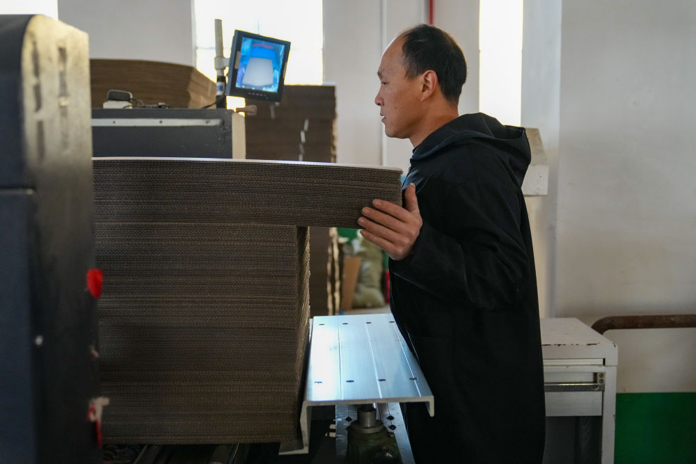 春節前後,位於大瑤鎮的瀏陽市凱洋包裝廠裏,印刷、裁剪、摺疊、黏合……自動化生產線每天下線5萬多個紙箱。