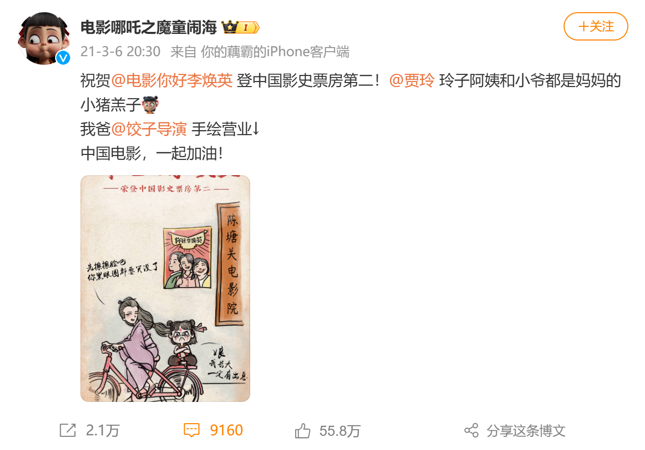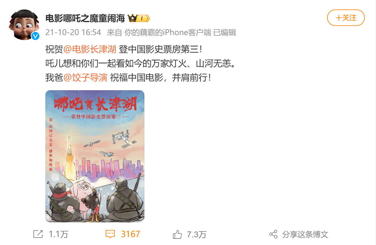 2021年,吒兒《哪吒之魔童降世》也曾為影片《你好,李煥英》《長津湖》送上祝福。