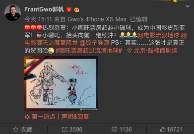 這不是兩部系列電影的第一次“接力”,2019年,電影《哪吒之魔童降世》票房超過《流浪地球》時,導演@郭帆FrantGwo 也曾發圖祝賀。