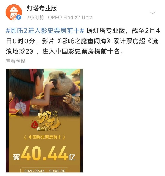 據燈塔專業版,截至2月4日0時0分,影片《哪吒之魔童鬧海》累計票房超《流浪地球2》,進入中國影史票房榜前十名。